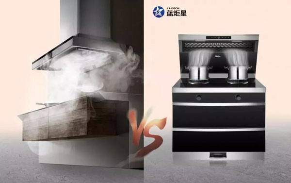 ▲传统油烟机vs新城注册集成灶侧吸下排